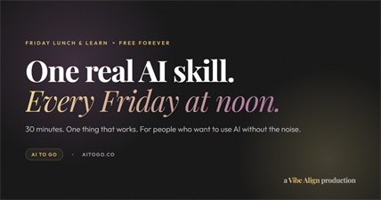 A weekly 30-minute session teaching one practical AI skill, shown live, free forever. Built for small business owners, parents, and professionals who want to use AI without the hype. Every Friday at noon CT. Sign up at aitogo.co.